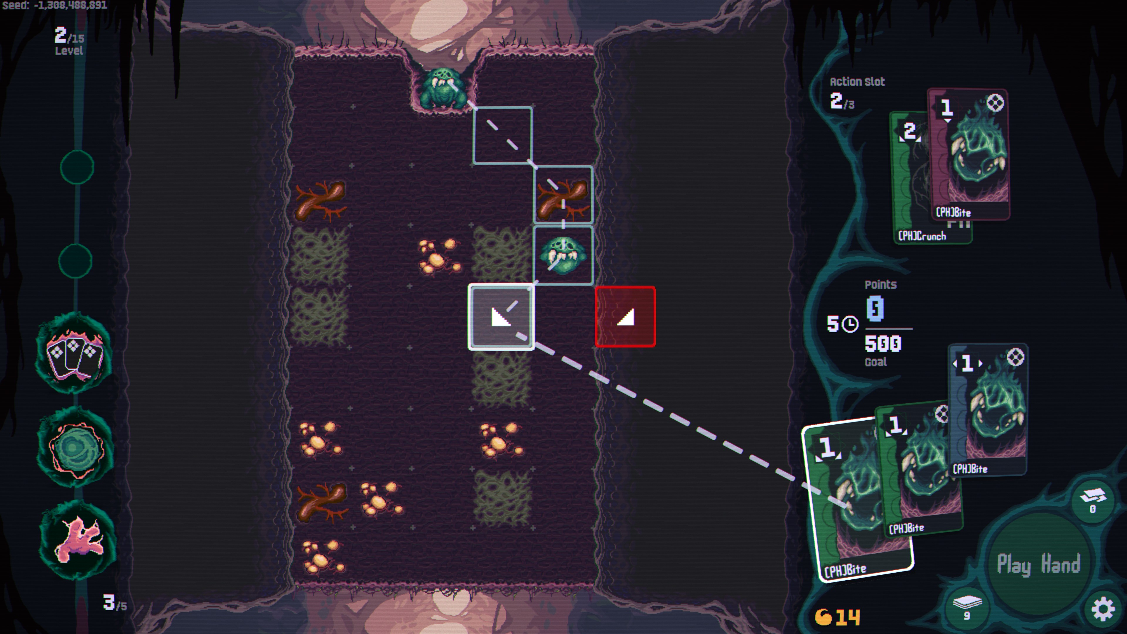Evolve or Be Digested: The planet is mutating, and you must too. Customize your deck with Evolutions and Mutators that allow for wild run-to-run builds. Turn a simple "Move Left" card into a terrain-shattering explosion or a resource-vacuuming tool.